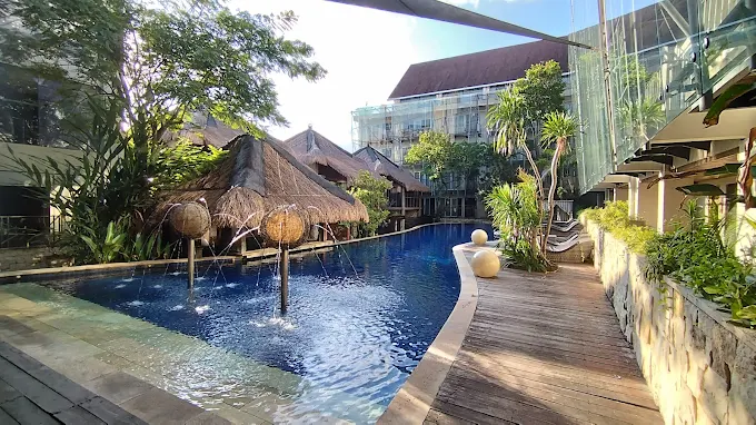 For those seeking relaxation and rejuvenation, the resort offers an exceptional spa experience, where guests can indulge in traditional Balinese healing treatments designed to relax both body and mind. The hotel’s outdoor pool, surrounded by lush tropical gardens, provides a tranquil space to soak up the sun and enjoy Bali’s natural beauty.