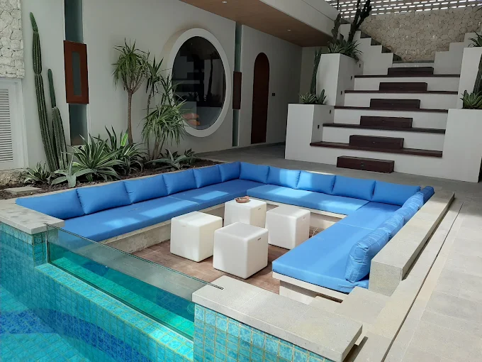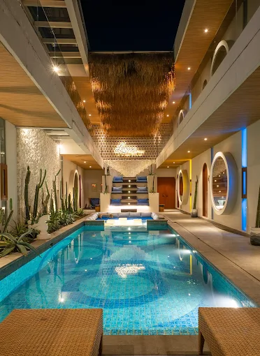 The villa features a limited number of thoughtfully designed Suite Camp rooms, each created with warm interiors and modern amenities. From cozy sitting areas and king-size beds to elegant bathtubs and calming décor, every room is tailored for guests who appreciate privacy and minimalism. Step outside to enjoy the shared pool and sun deck, surrounded by tropical greenery and a peaceful atmosphere — ideal for a quiet morning coffee or a lazy afternoon under the sun.